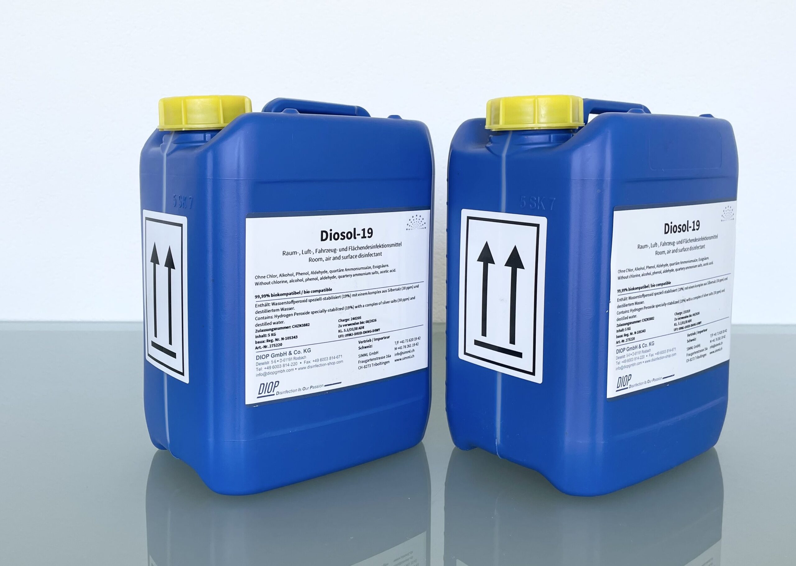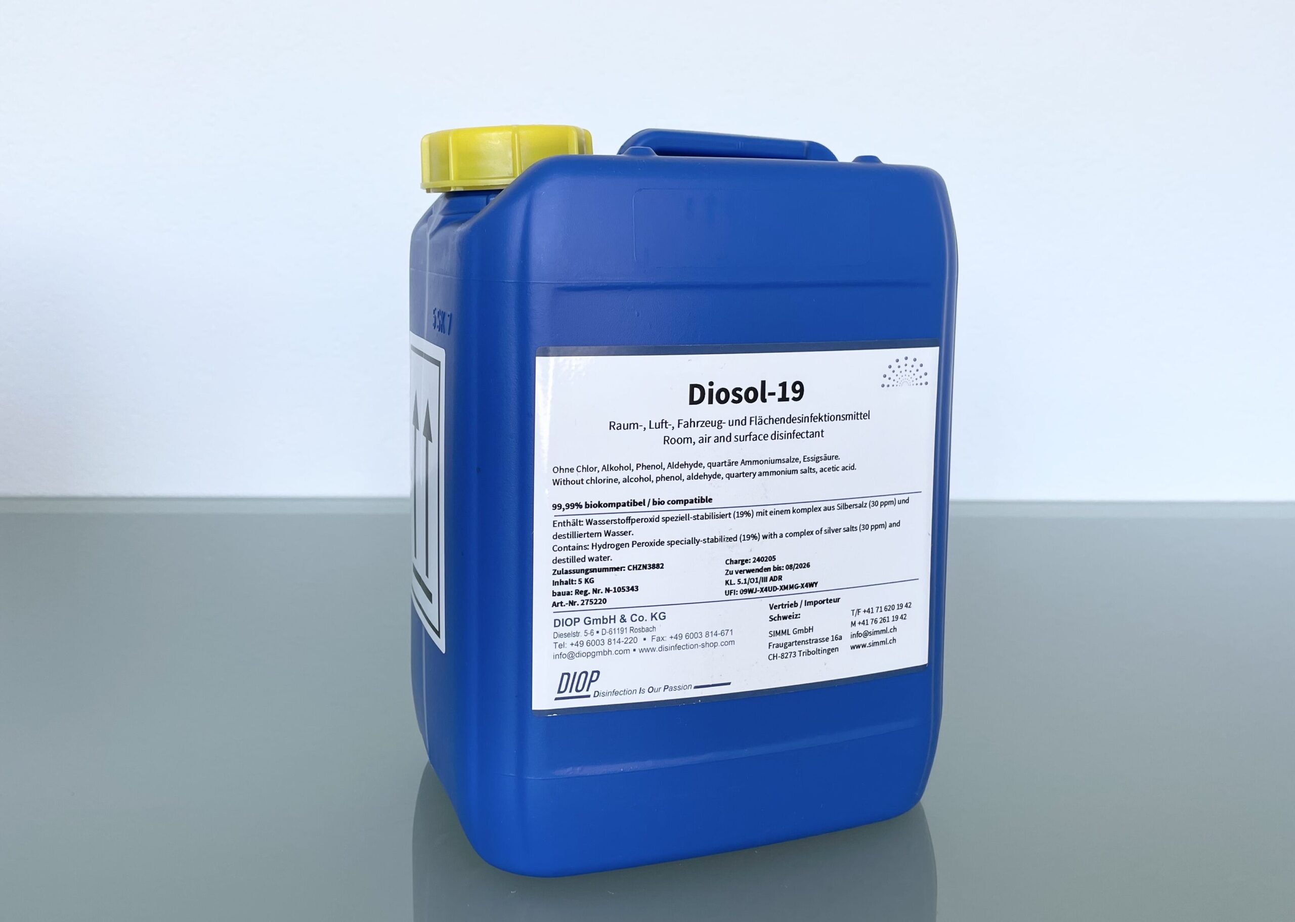 Diosol-19 ist ein hocheffektives Breitband-Wasserstoffperoxid-Desinfektionsmittel. Der Wirkungsbereich umfasst gramnegative und grampositive Bakterien (einschliesslich Legionellen), aerobe Sporenbildner, Hefen und Schimmelpilze sowie wesentliche humanpathogene Viren (u.a. Herpes, Hepatitis, HIV, Influenza, Noroviren, Adenoviren etc.).