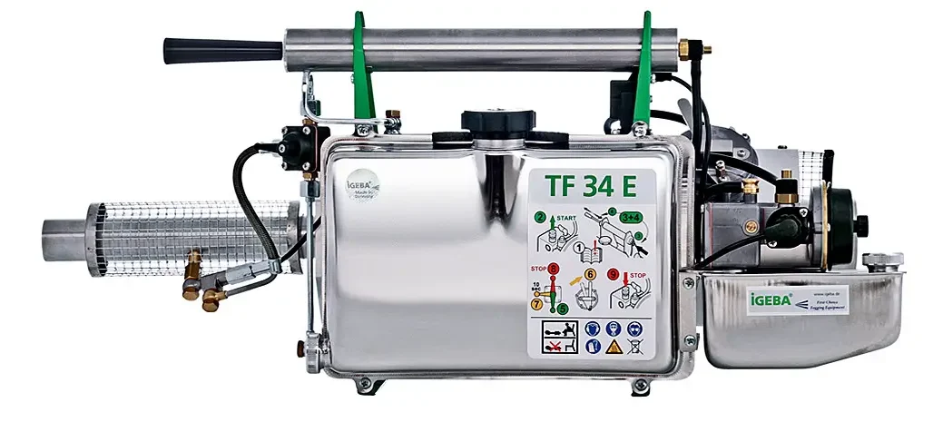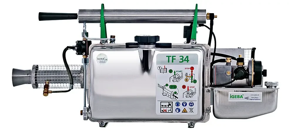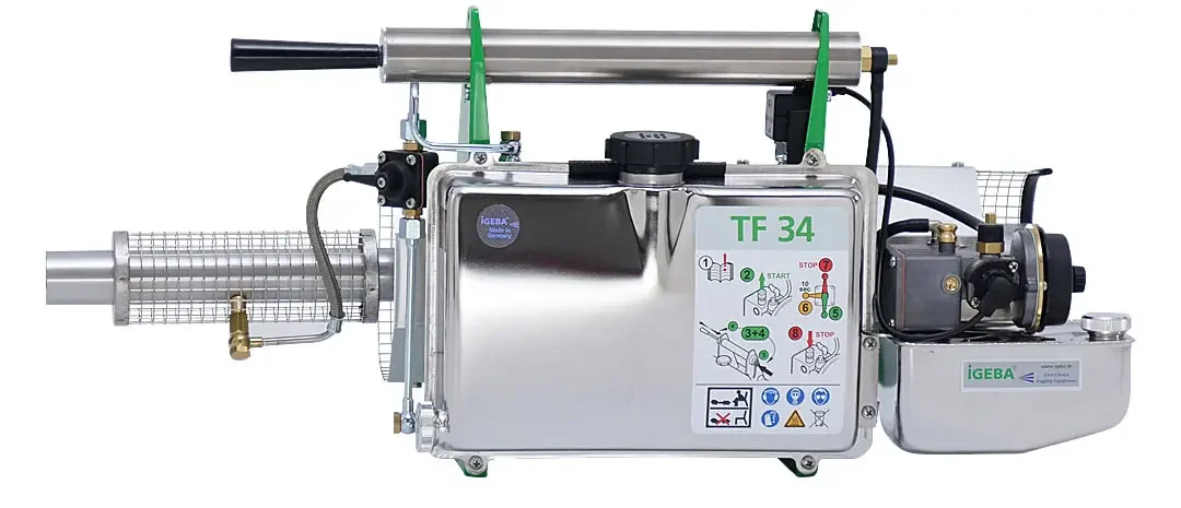 Mit nur 78 cm Gesamtlänge und 6,6 kg Leergewicht ist der TF 34 ein kleines und leichtes Thermalnebelgerät. Bei der Entwicklung wurde das Hauptaugenmerk auf die Vernebelung in geschlossenen Räumen gelegt. Es zeichnet sich durch kompakte Bauweise, geringes Gewicht sowie ausgezeichnete Emissionswerte aus. Natürlich ist es ebenfalls für den Außenbereich geeignet.